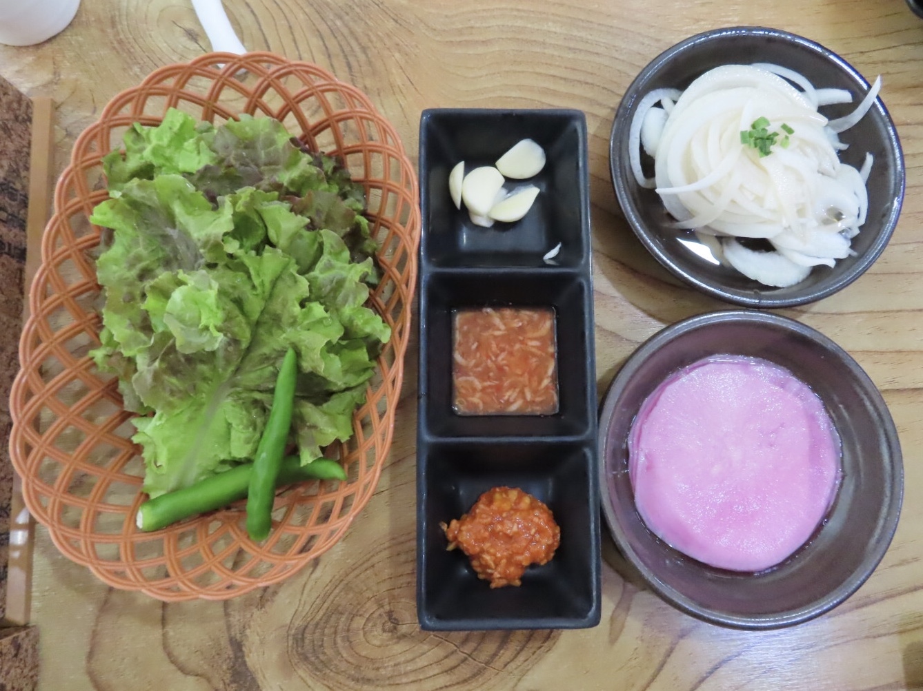 쌈무, 양파장아찌, 마늘, 쌈장, 새우젓까지